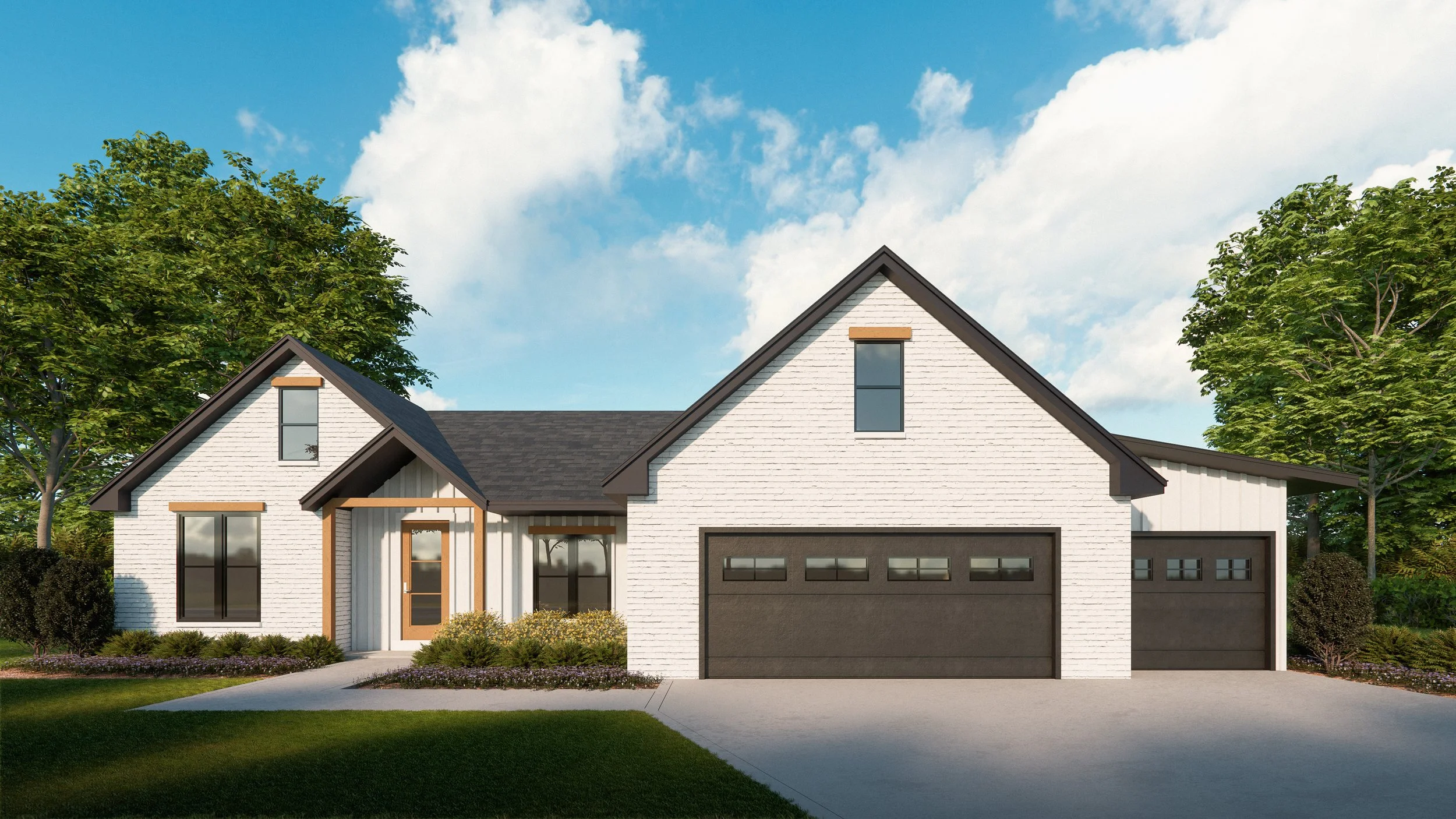 Both have bright white brick, sleek black accents, and warm wood details give this modern farmhouse instant curb appeal. With three garage bays, large windows, and an inviting entry, it blends style and function effortlessly—perfect for buyers seeking contemporary design, comfort, and character in a home.